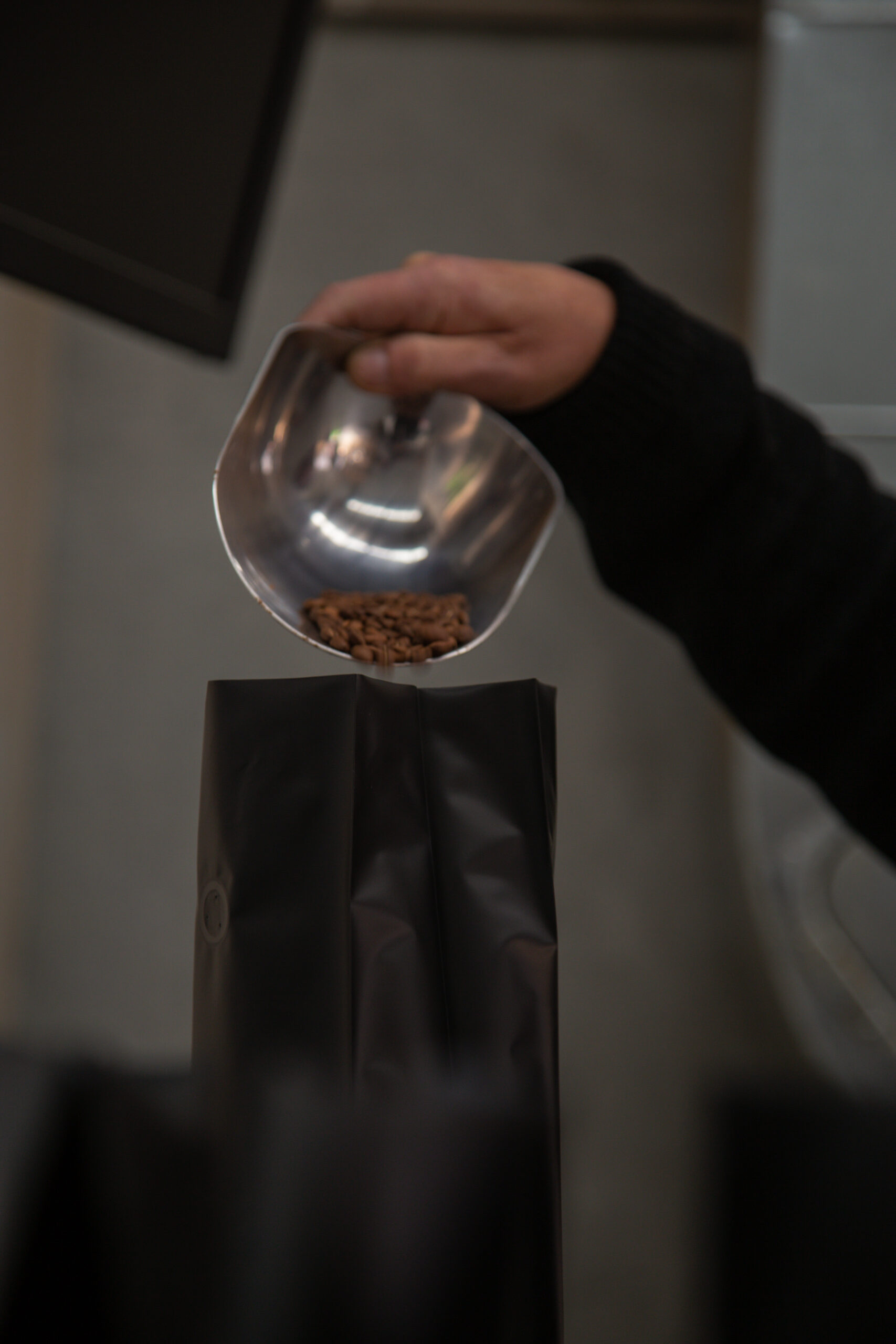 metal scoop pouring coffee beans